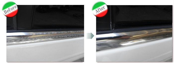 色あせて艶のなくなってしまった樹脂部分・メッキーモール等の艶、輝きを復活させます。