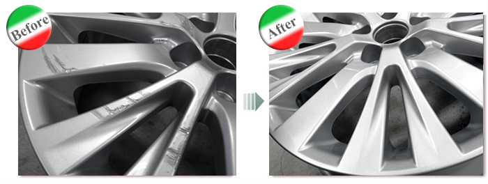 | カケ | アルミホイールにカケが生じてしまった場合には、アルミ溶接と同等の強度・軽さを保ちながら、簡単にキズを埋める事のできる特殊なパテを使用して成形します。ですから、施工後は、上の写真のようにそこがカケてしまっていた事が分からなくなるほど美しく仕上がります。 |